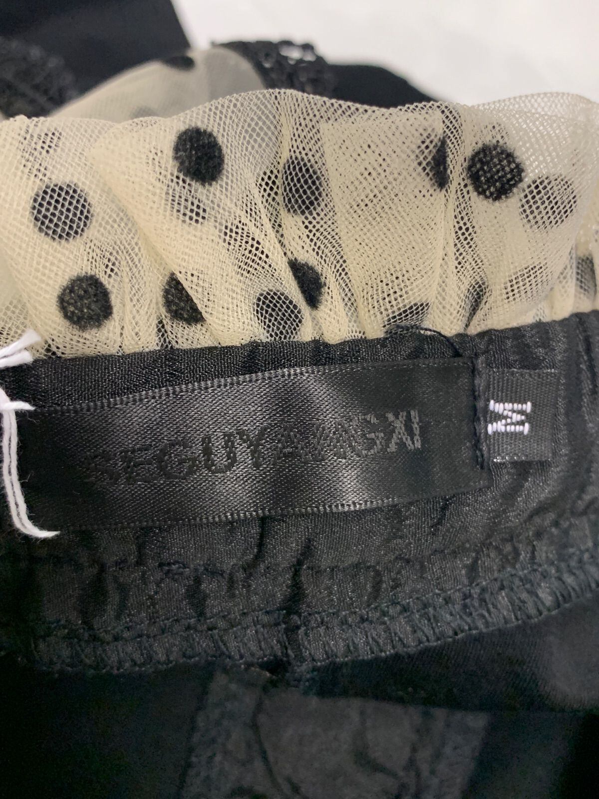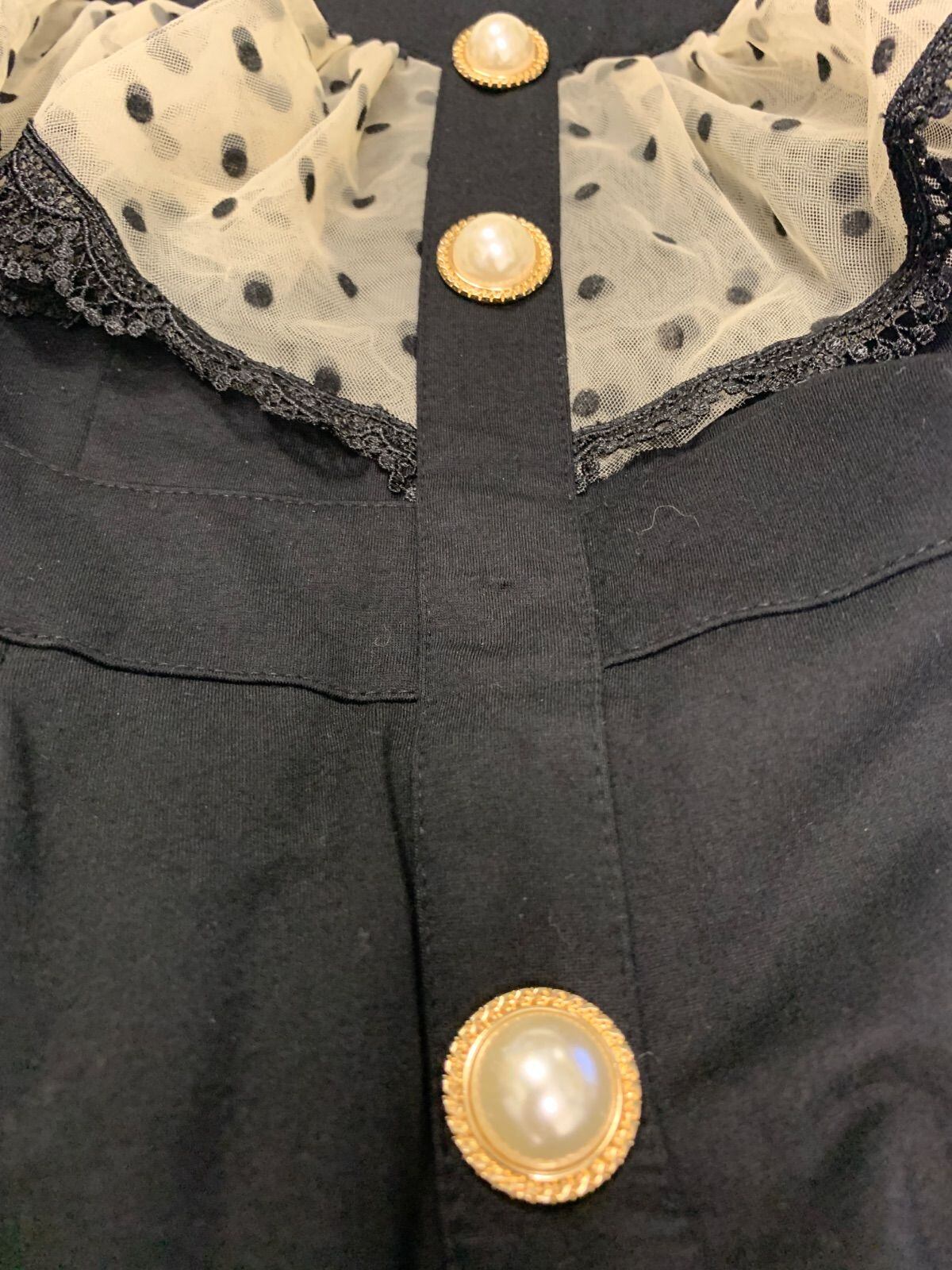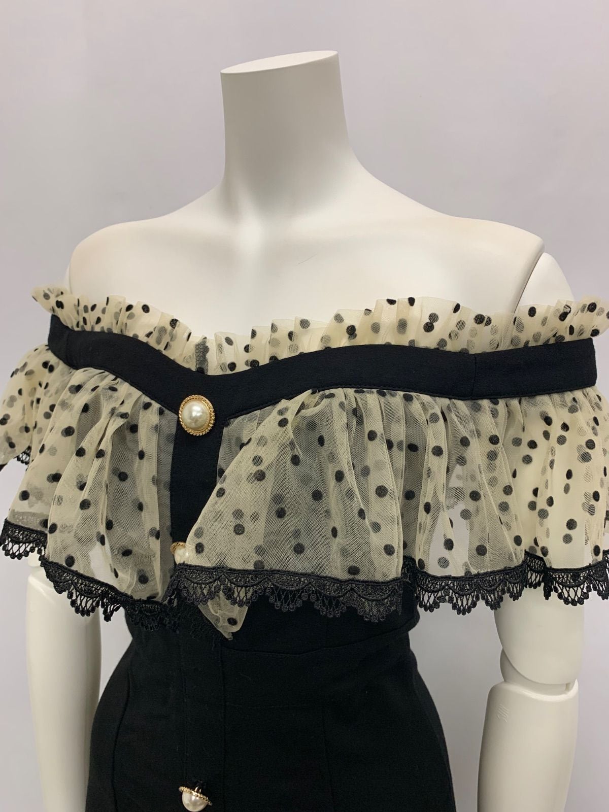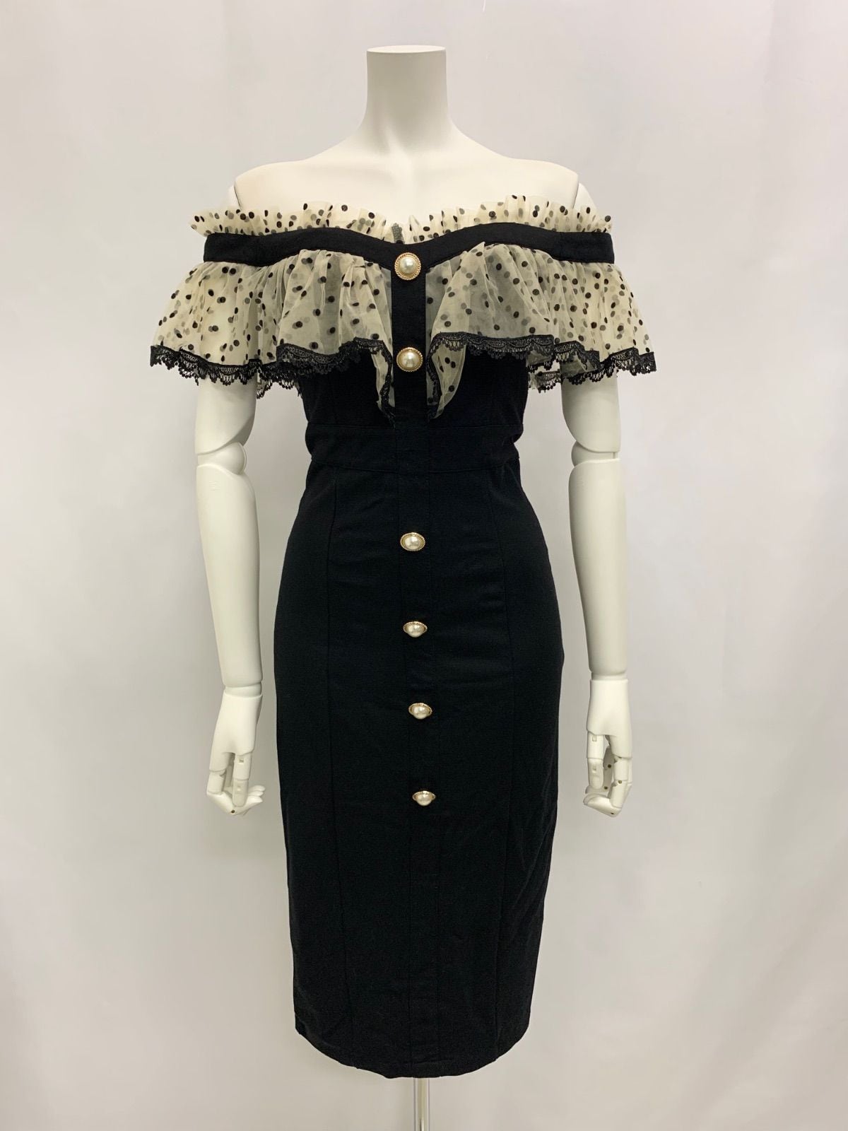 1047 SEGUYANGXI キャバクラ ドレス オフショル ドット レース シースルー ミディ タイト ストレッチ ゴールドパールボタン キャバドレス M