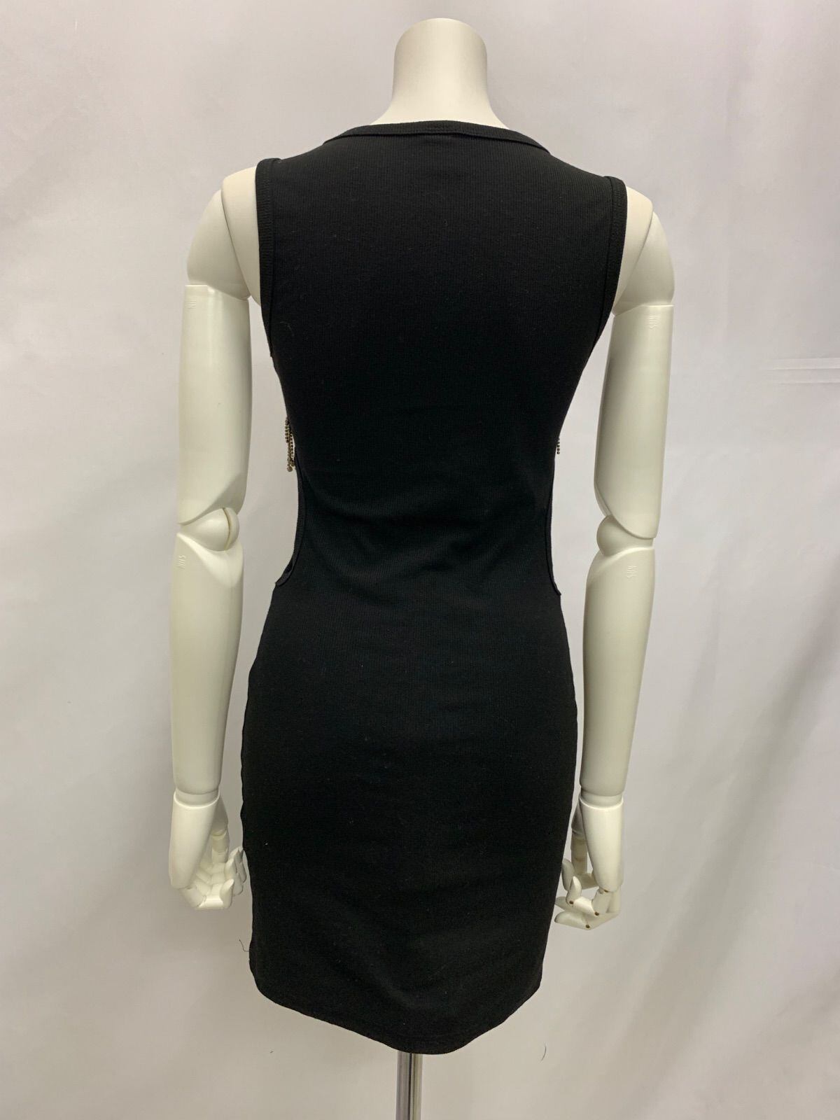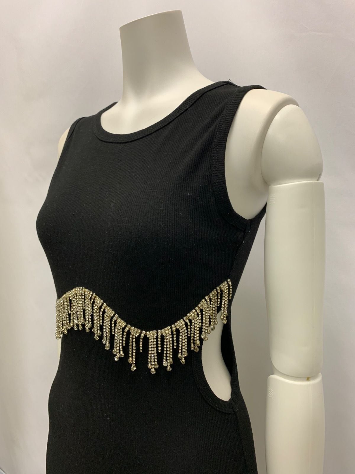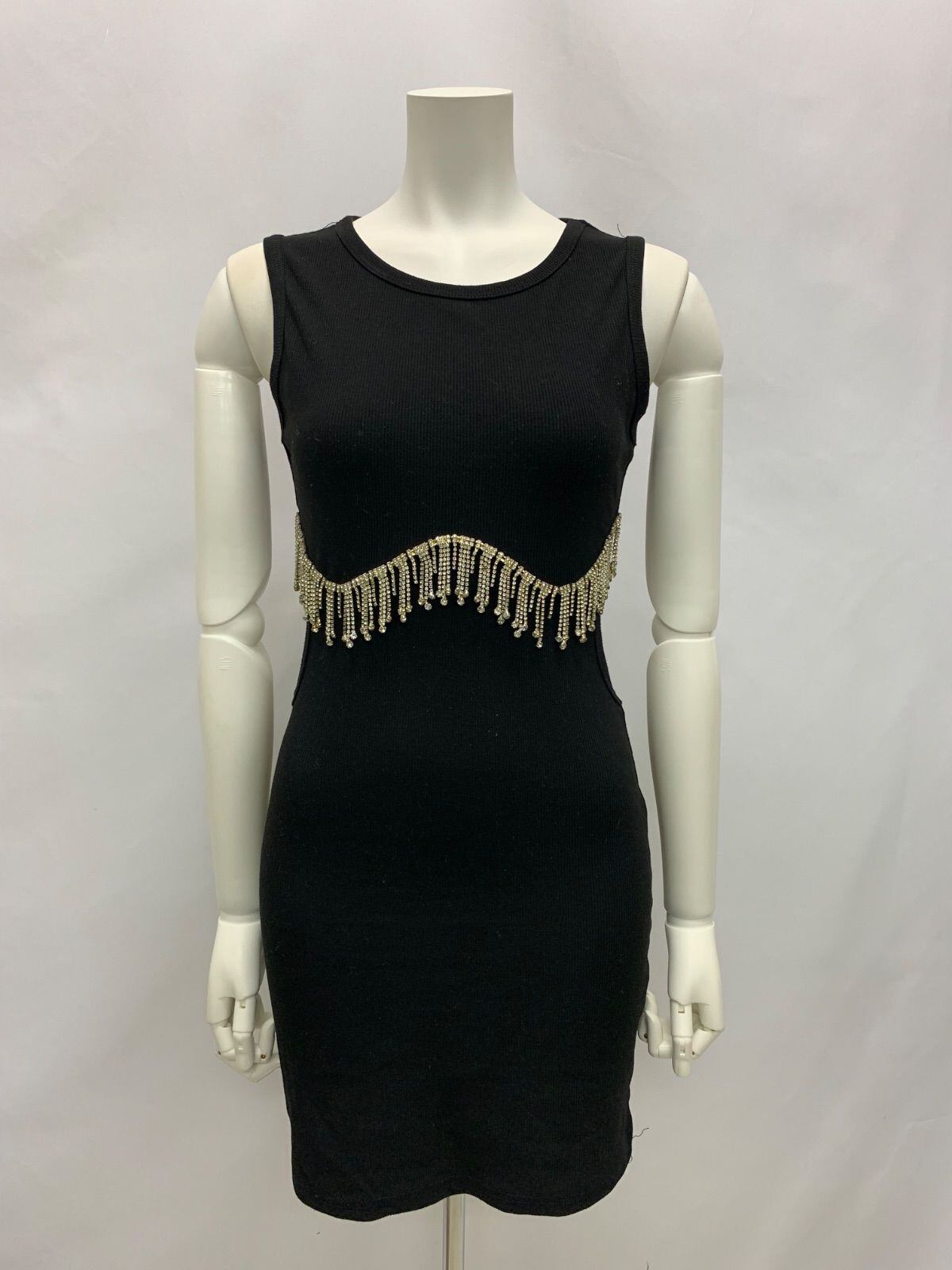1384 キャバクラ ドレス リブニット ワンピース タイト ウエストカット ストーン ビジュー ノースリーブ ミニ キャバドレス S