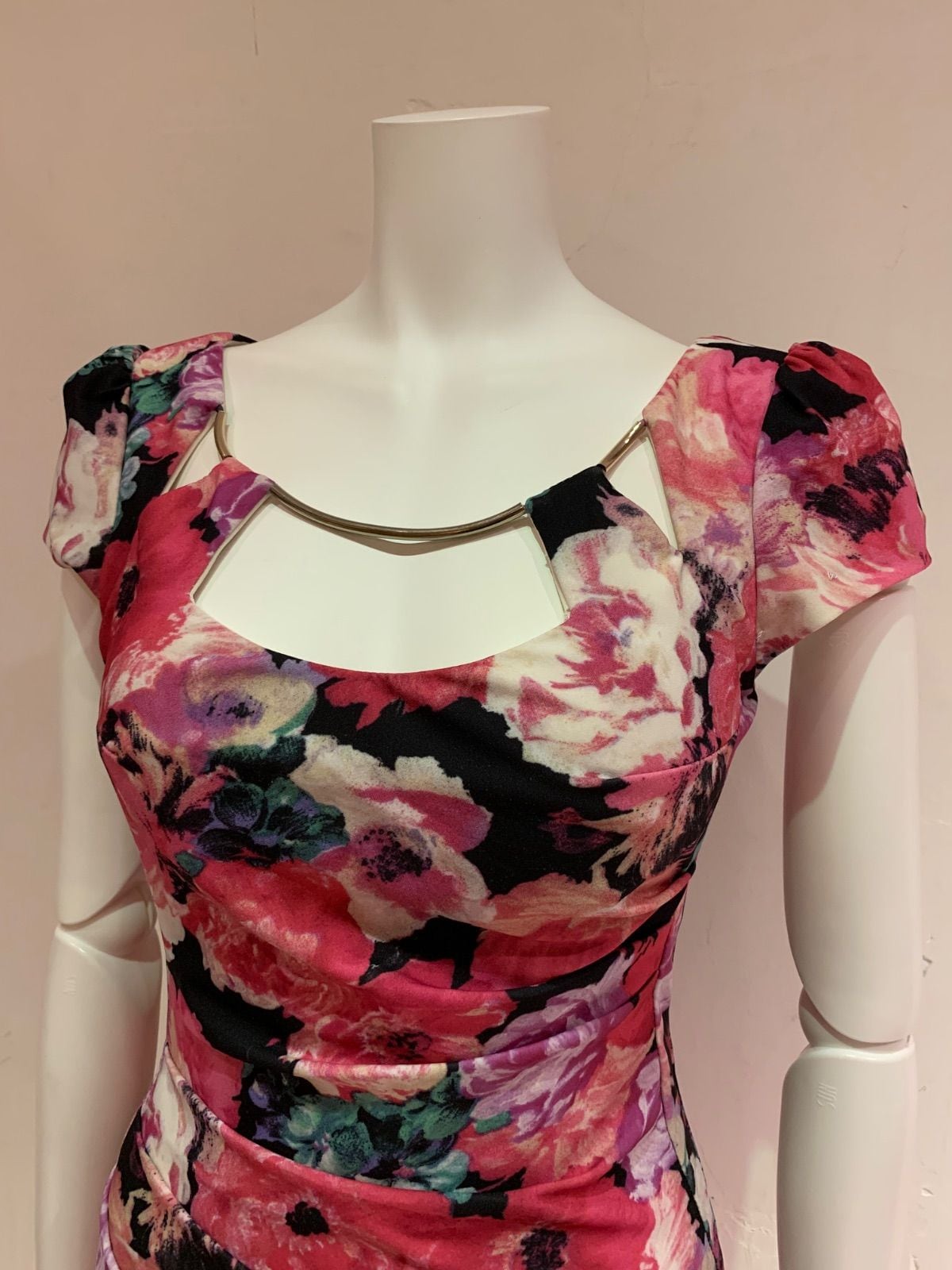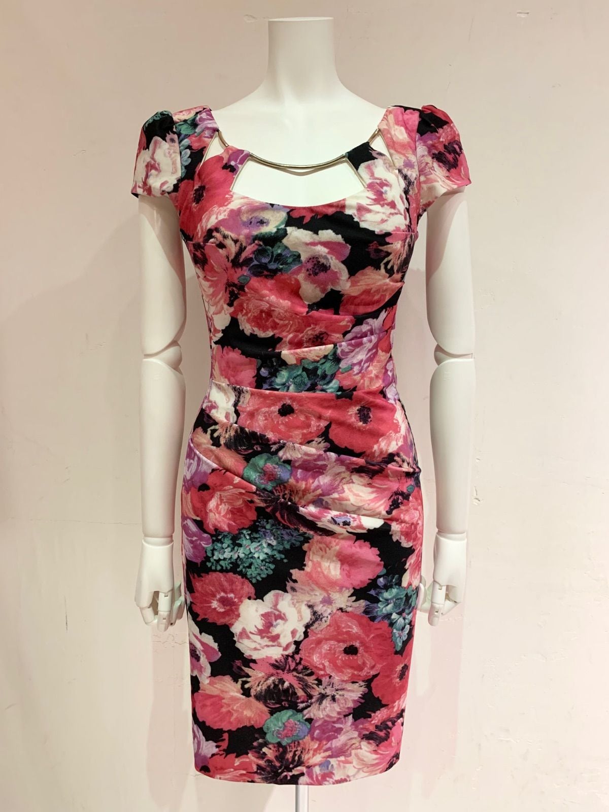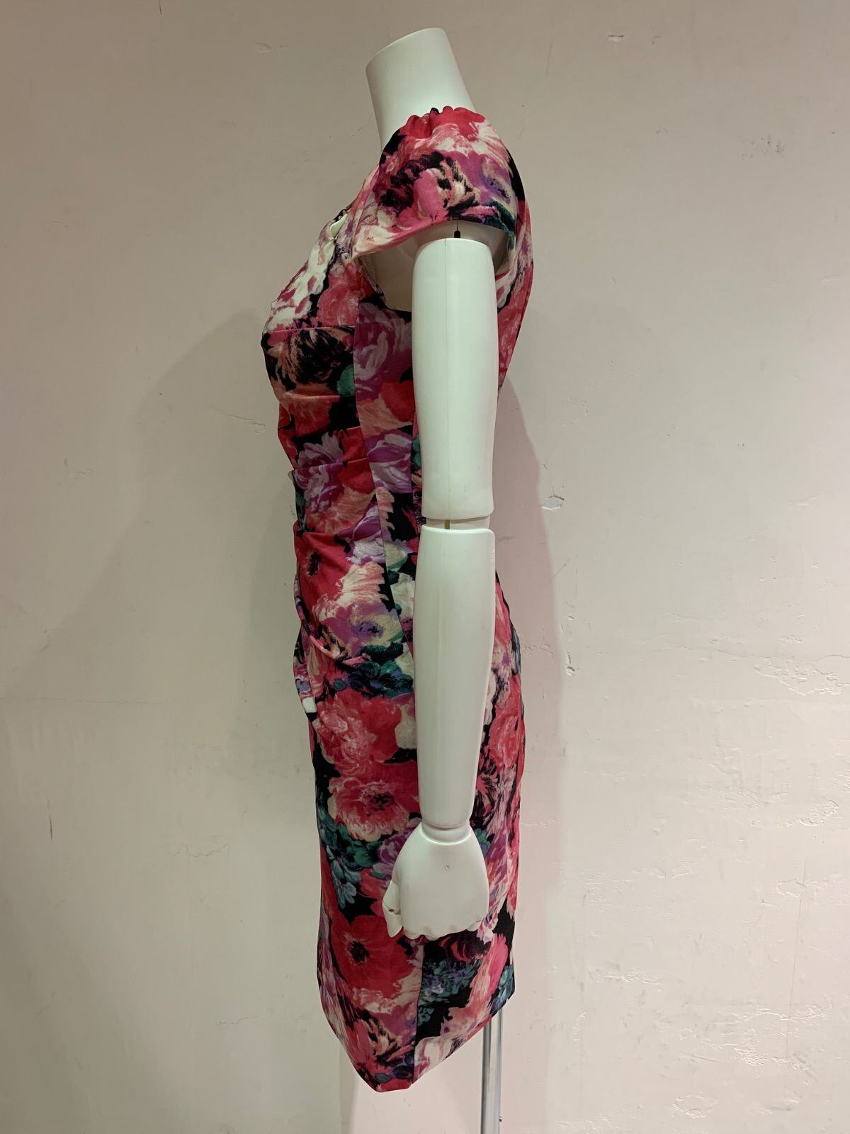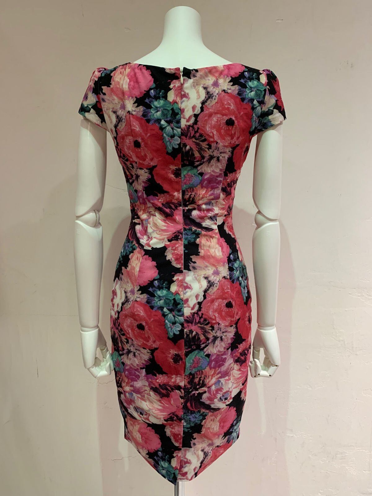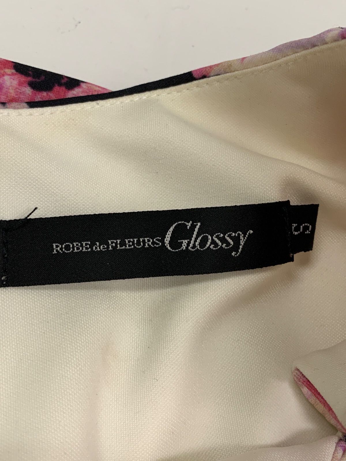1432 ROBE de FLEURS Glossy ローブドフルールグロッシー キャバクラ ドレス 花柄プリント タイト ミディ パフスリーブ フラワー 伸縮性 キャバドレス S