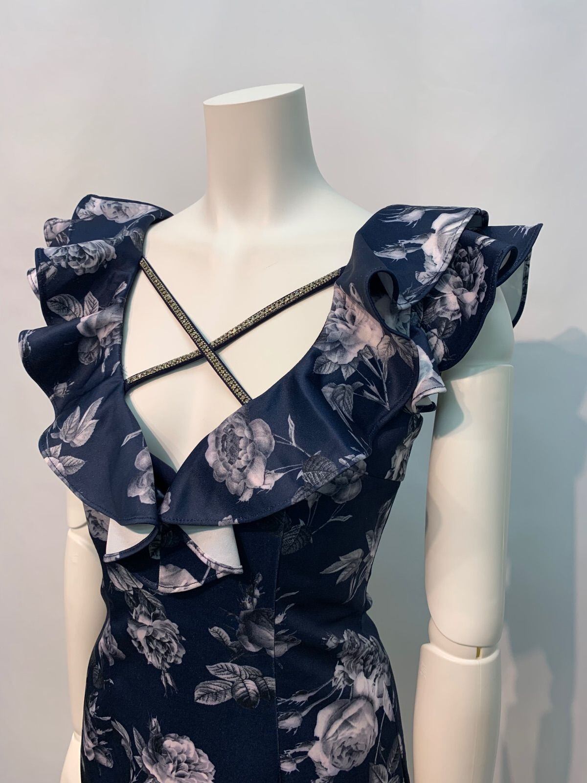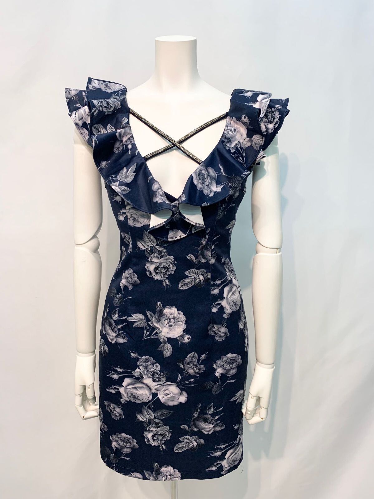 1608 an アン Andy アンディ キャバクラ ドレス バラ柄 フラワー 伸縮性 フリル クロス ストーン タイト ミニ キャバドレス M