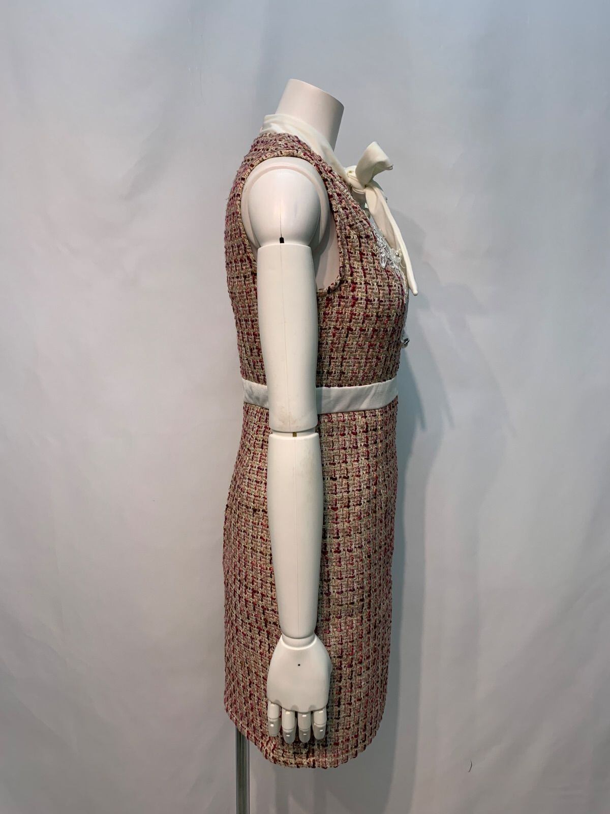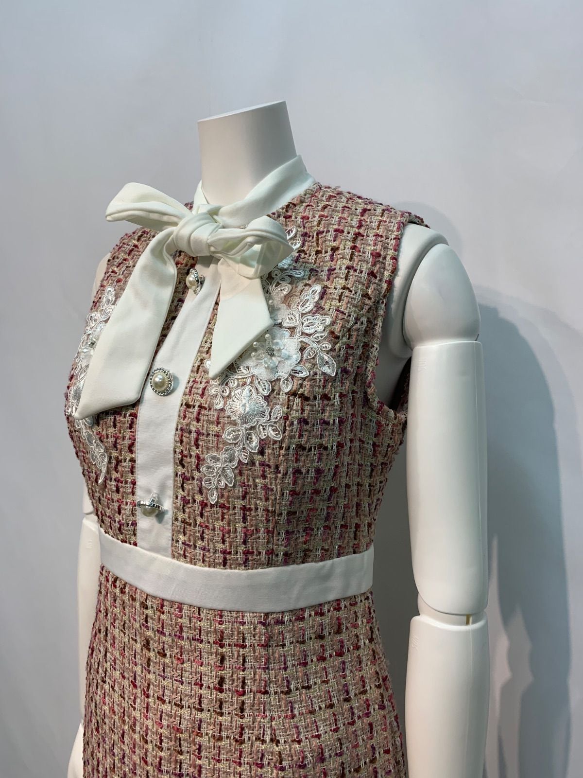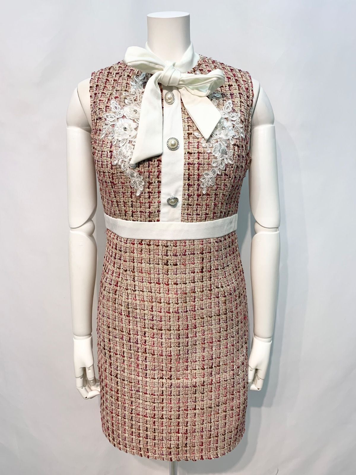 1671 Tika ティカ キャバクラ ドレス ツイード ラメ リボン ノースリーブ フラワー刺繍 ビジュー タイト ミディ キャバドレス M