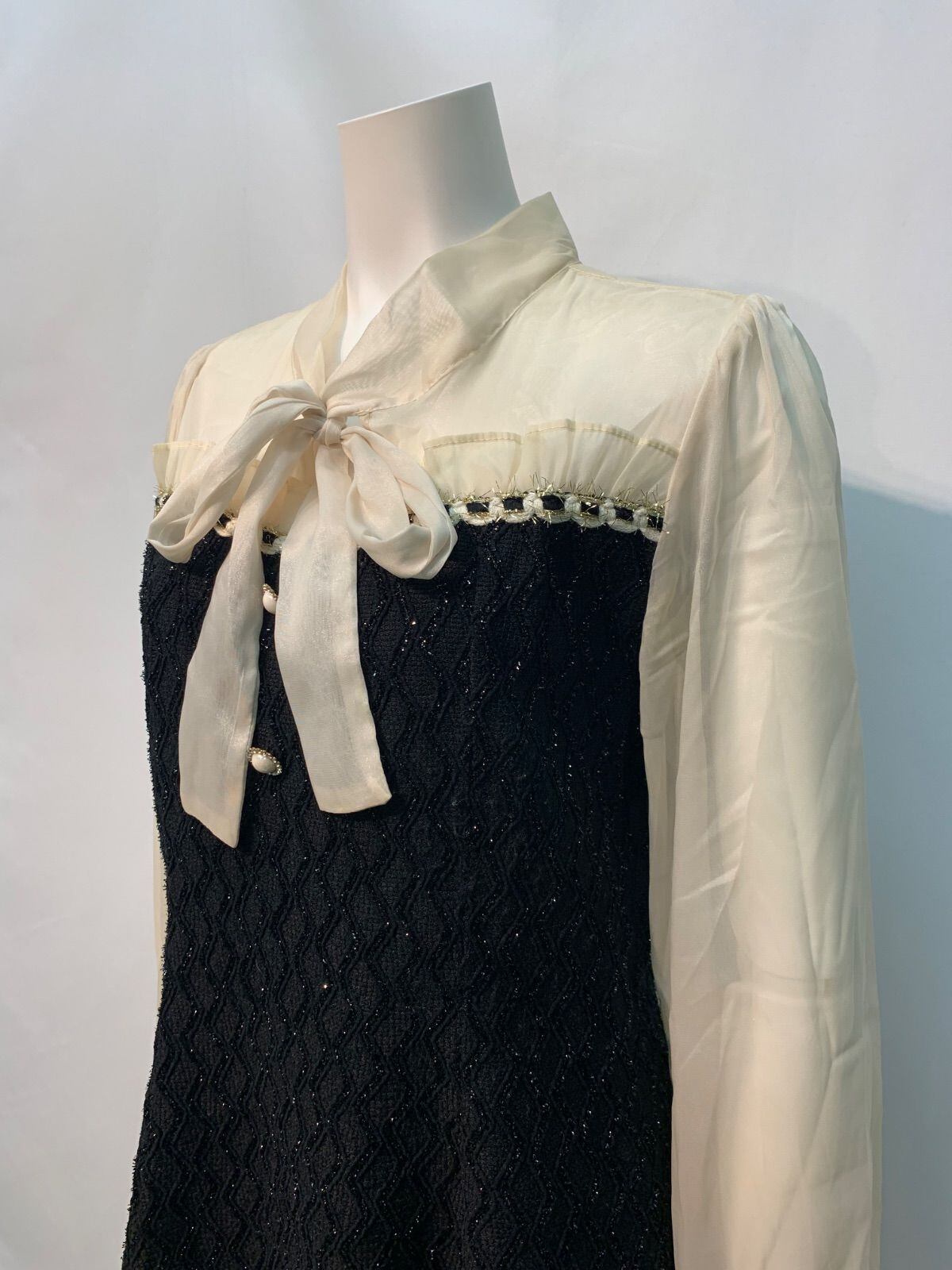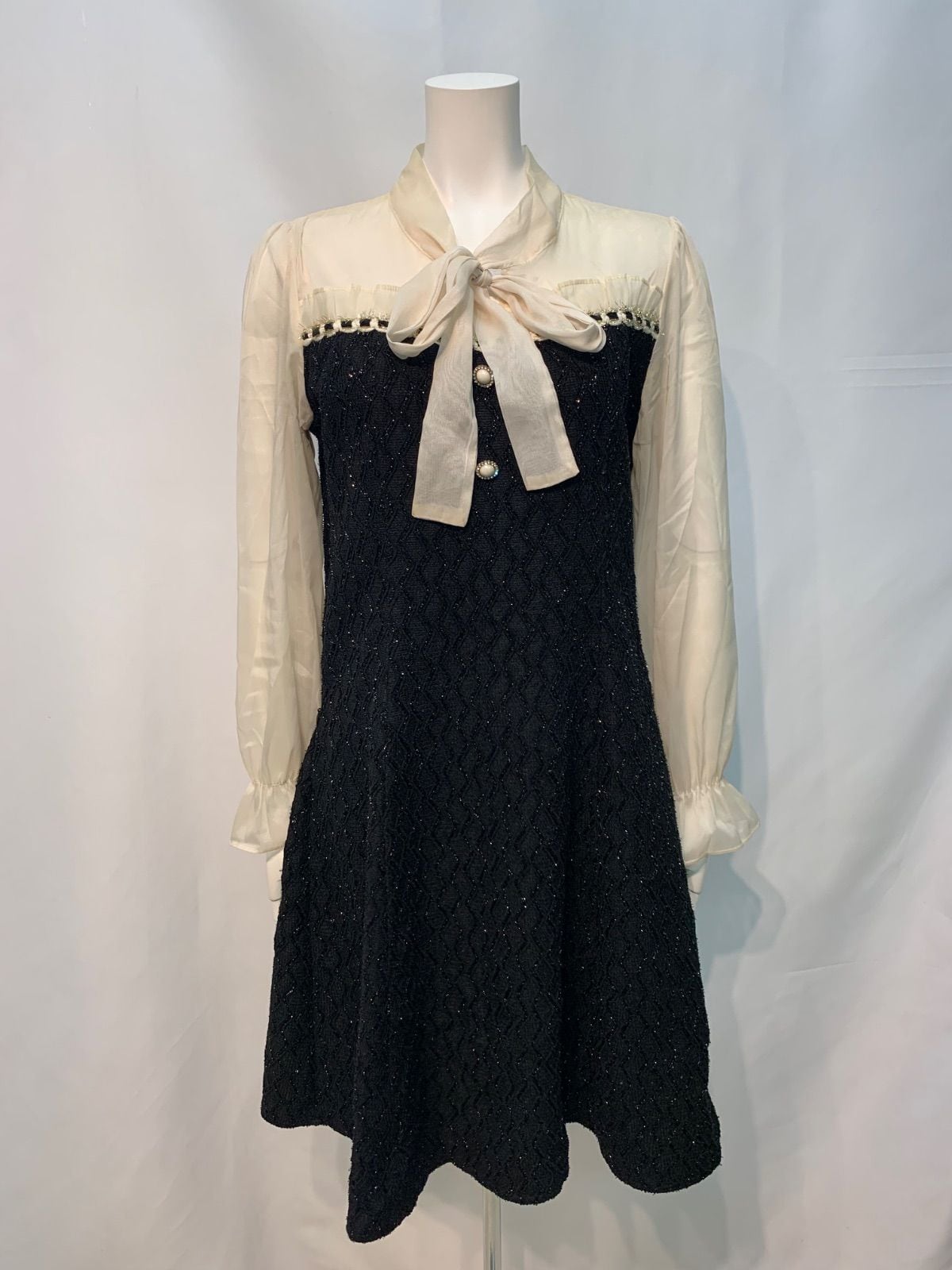 2006 キャバクラ ドレス シフォン シースルー ラメ キラキラ リボン フレア ビジューボタン キャバドレス L