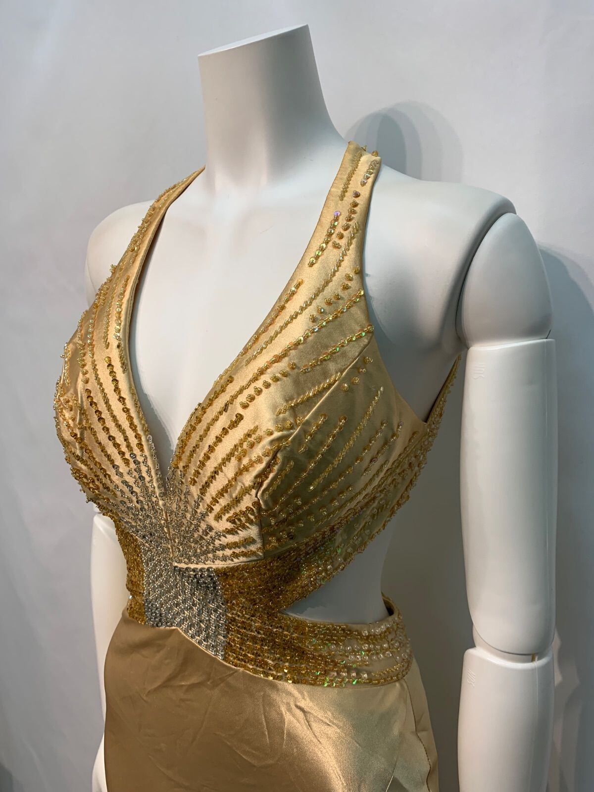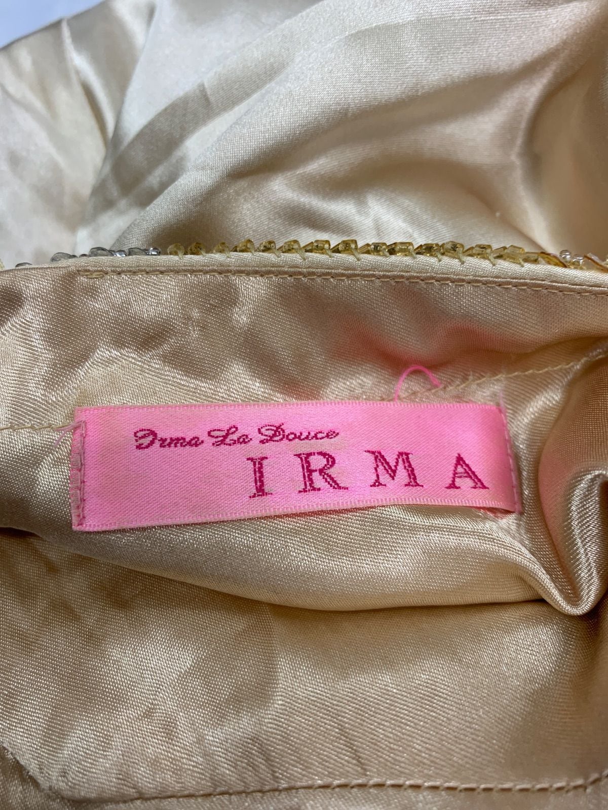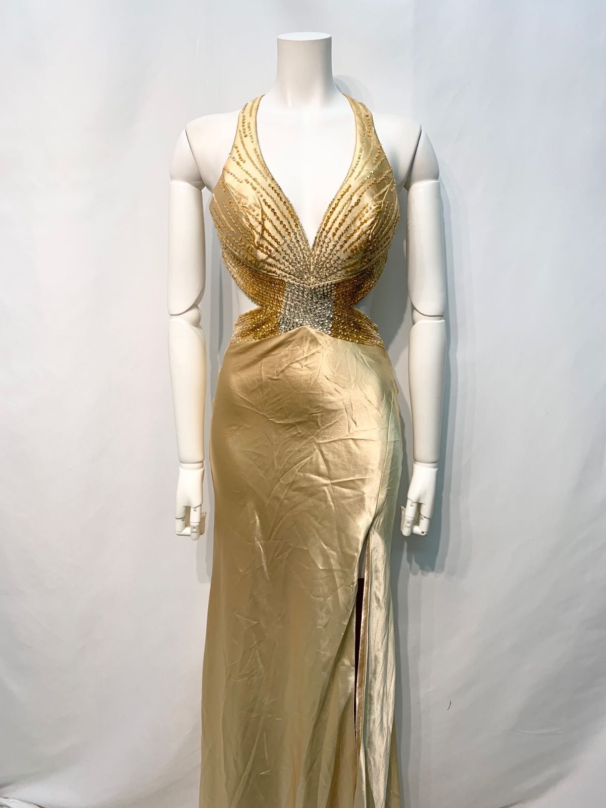 2133 IRMA イルマ キャバクラ ロングドレス サテン ホルターネック バックオープン ストーン ビーズ スパンコール スリット イベント キャバドレス M