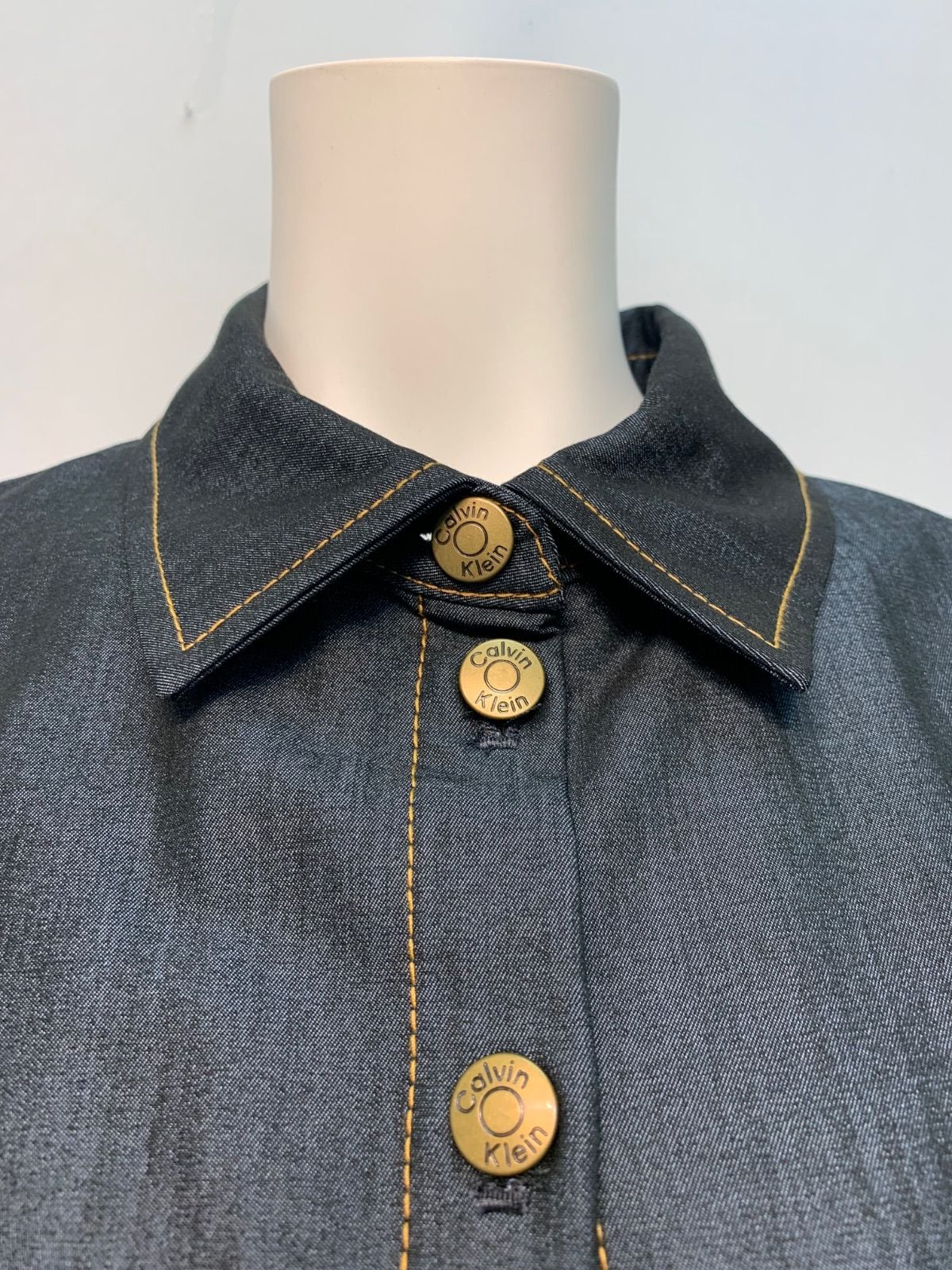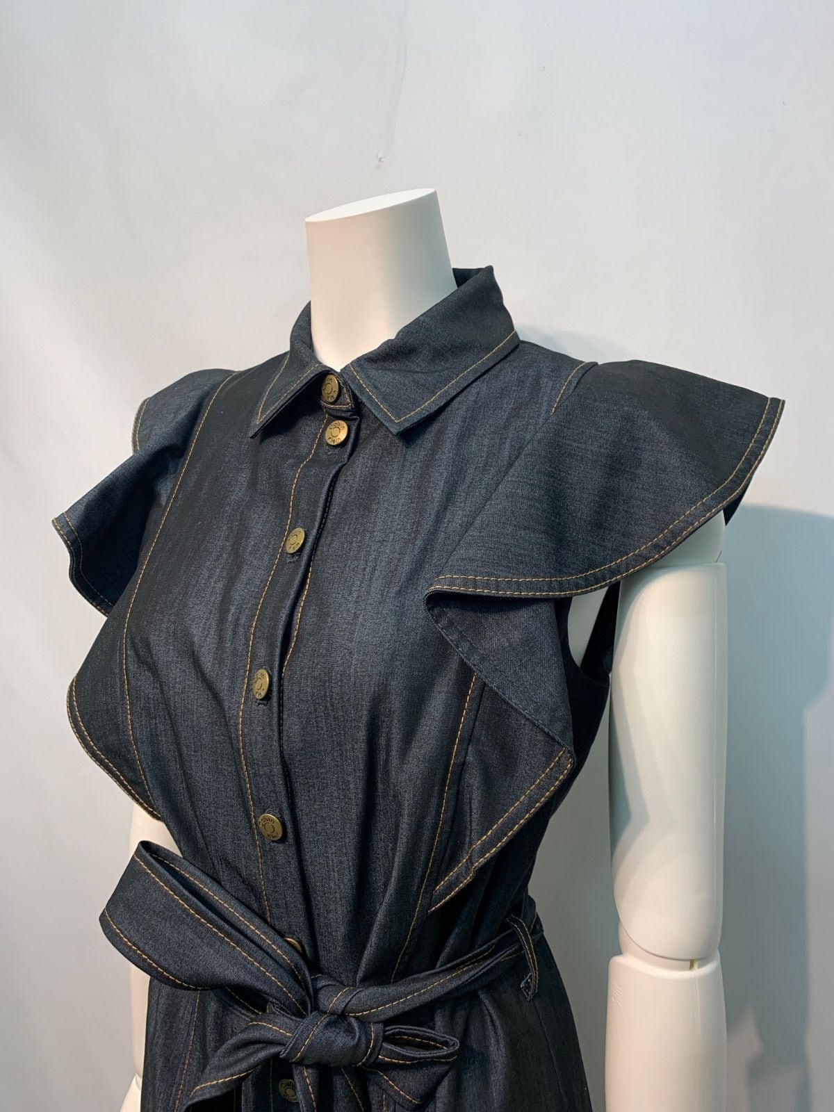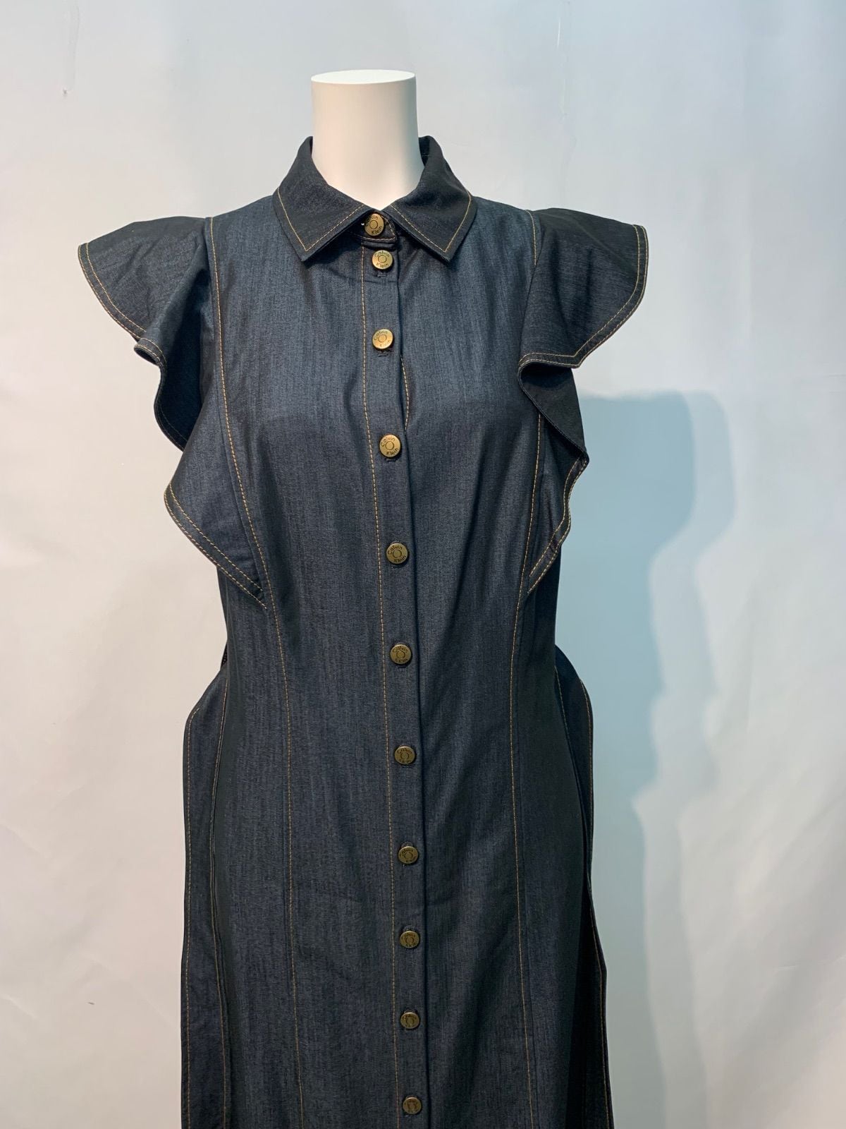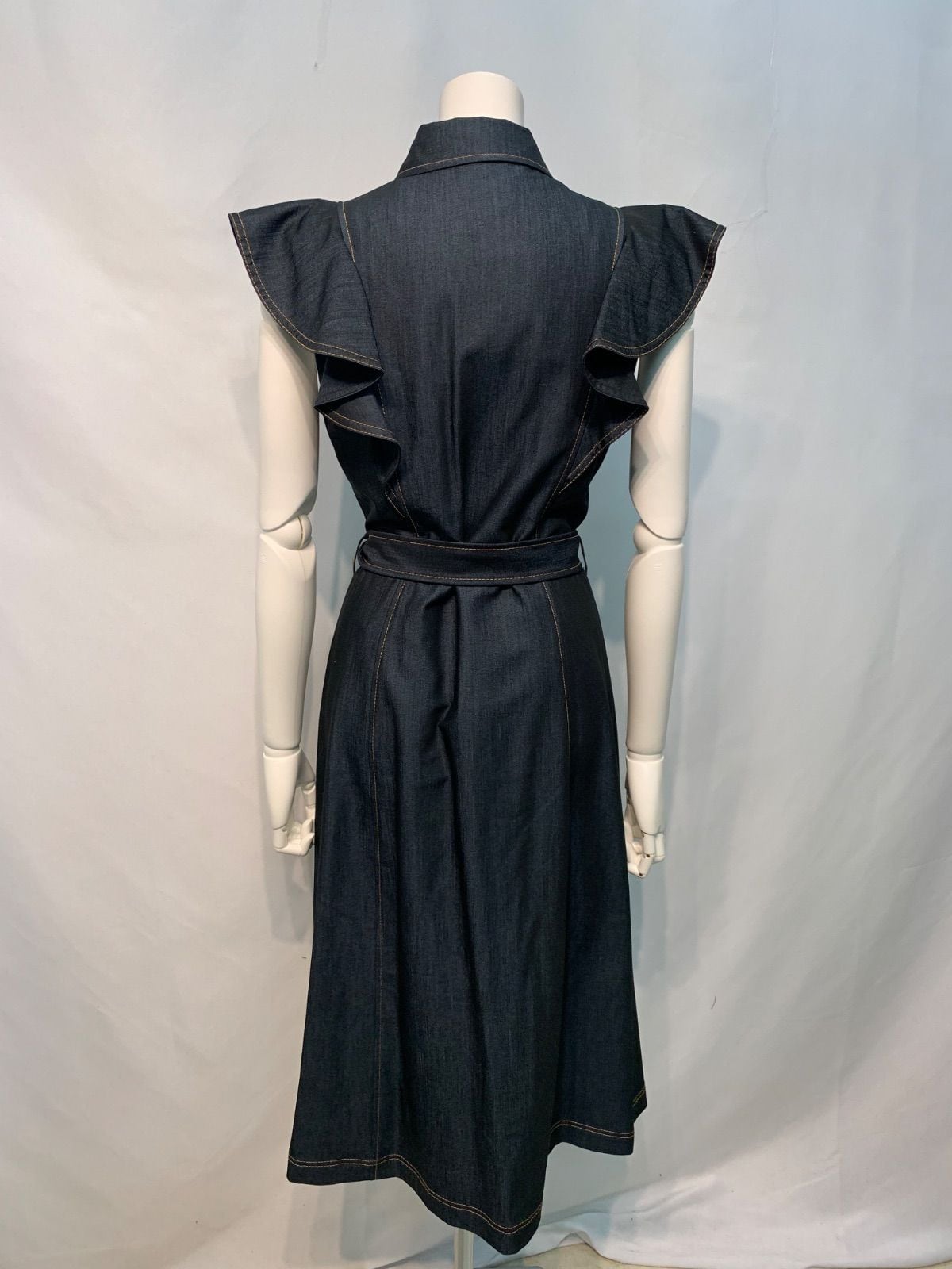 2260 Ck Calvin Klein カルバン・クライン デニム風 ノースリーブ シャツワンピース フリル ロング ウエストリボン インディゴ キャバドレス 2サイズ