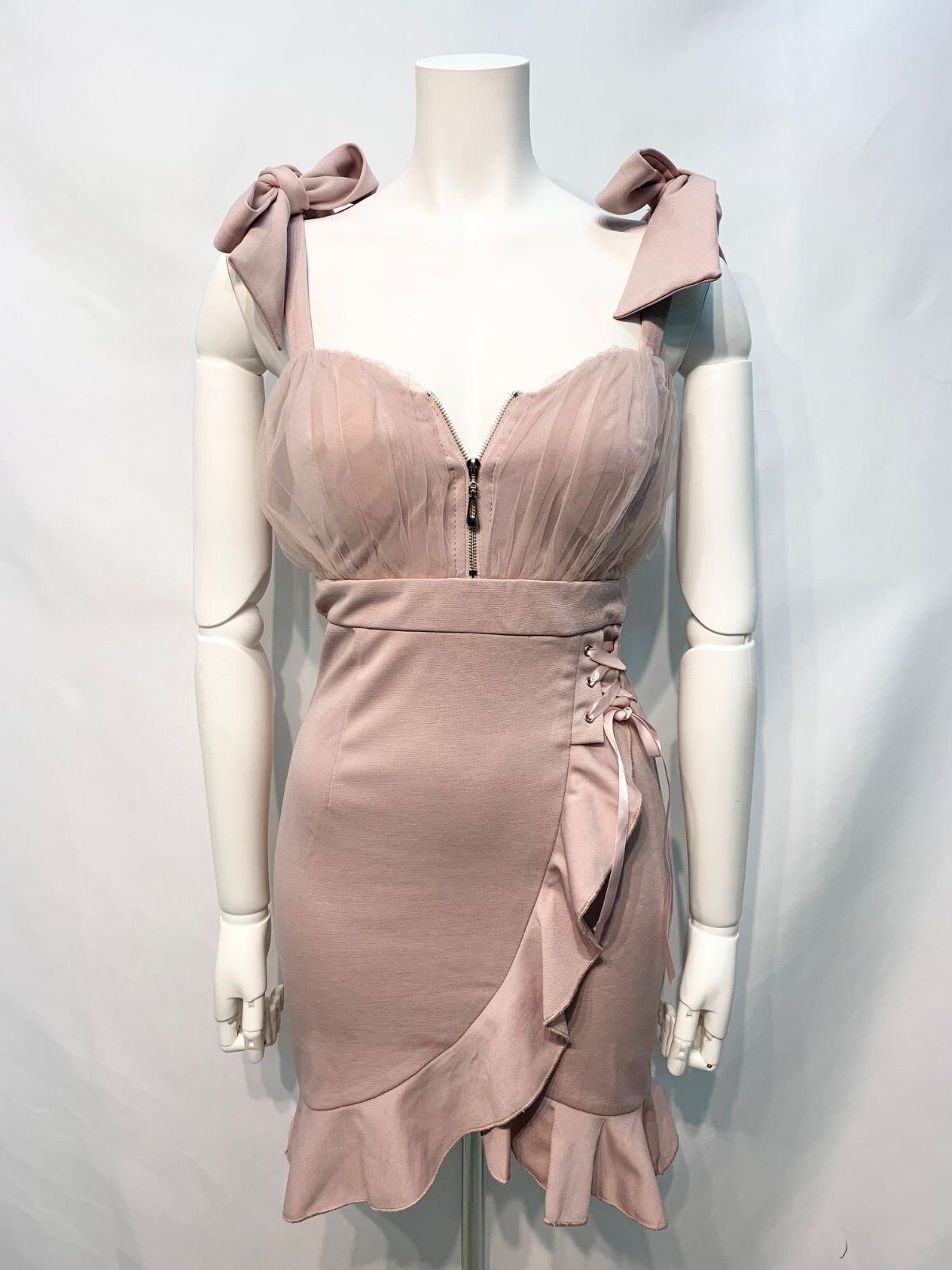2300 Tika ティカ キャバクラ ドレス リボンストラップ フリル レース タイト ミニ 伸縮性 キャバドレス S