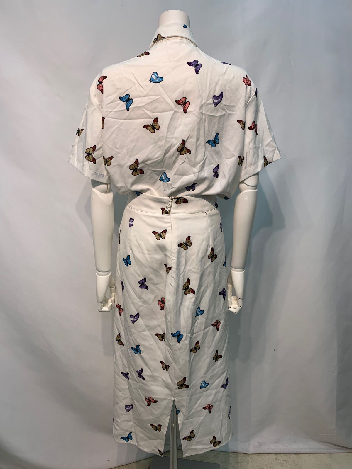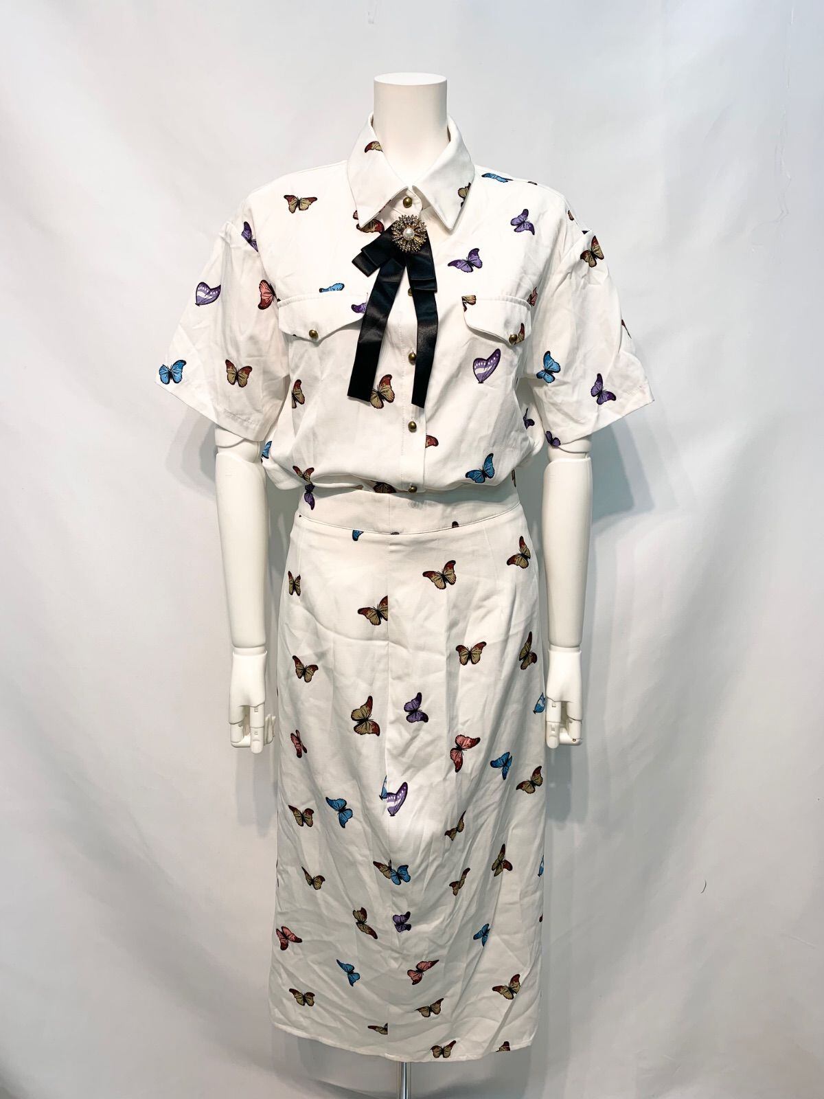 2543 蝶々柄 セットアップ スカート 半袖シャツ ブローチ付き バタフライ 総柄 ミディ キャバドレス