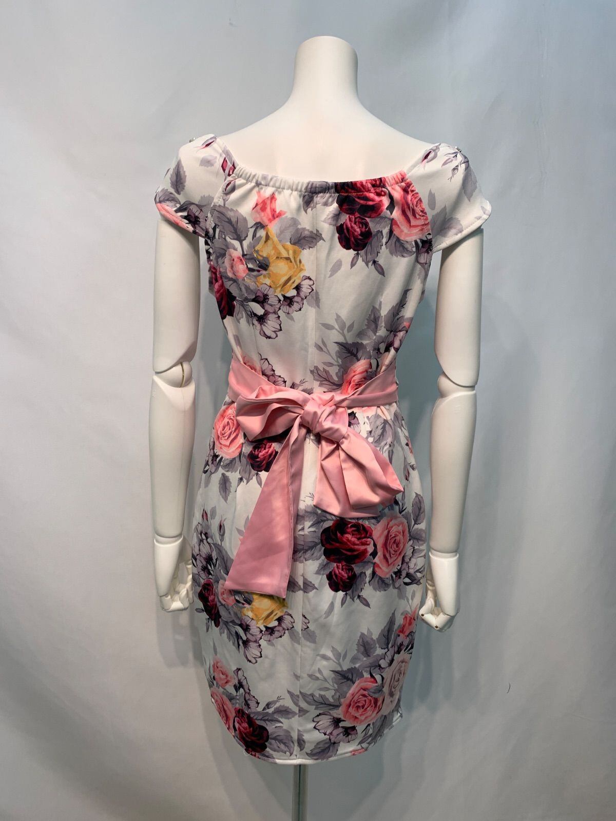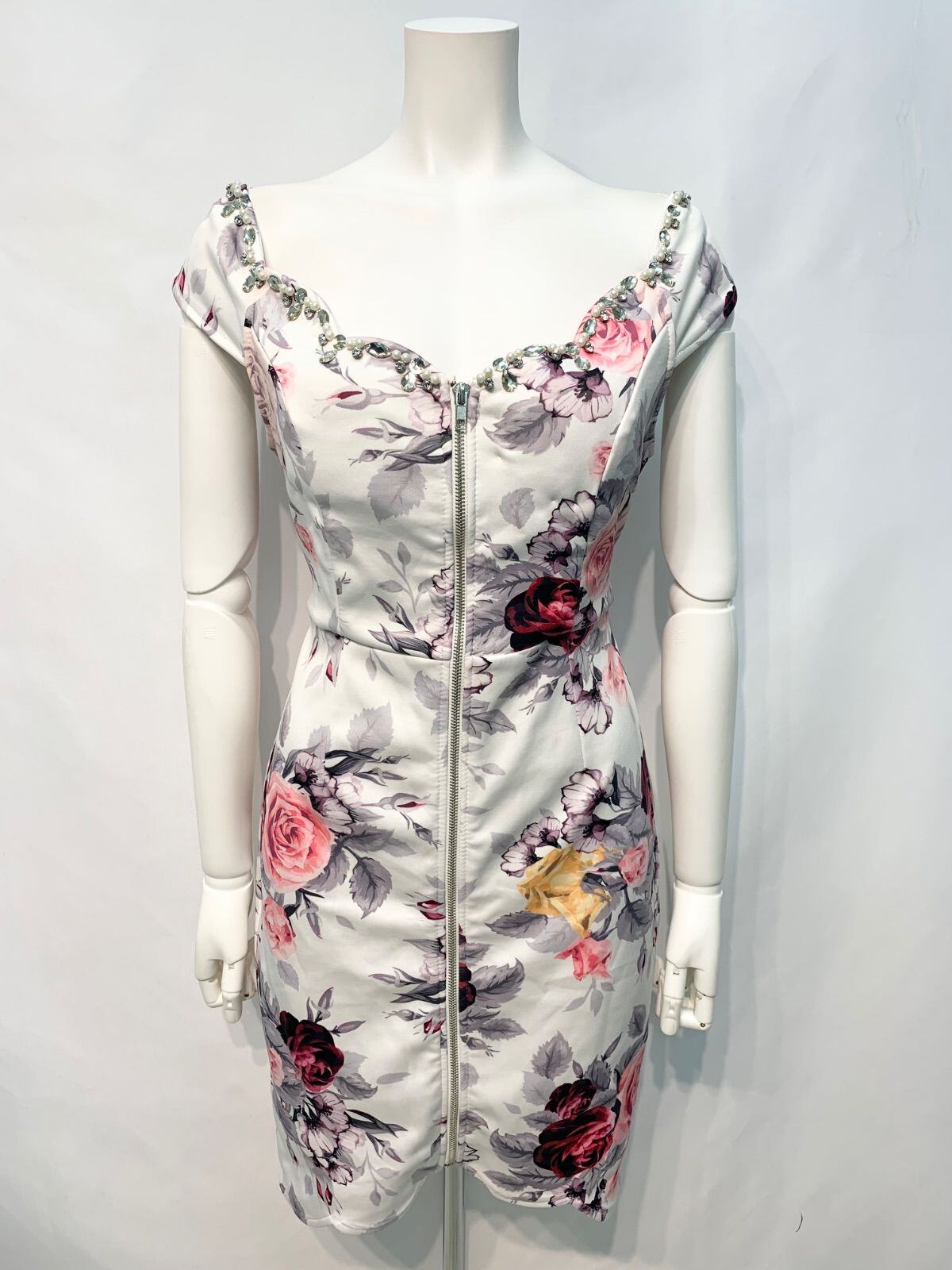 2472 DAZZY×HIKARU RAPHAEL デイジー×ヒカルラファエル キャバクラ ドレス 薔薇柄 ストーン バックリボン タイト ミニ 伸縮性 キャバドレス L