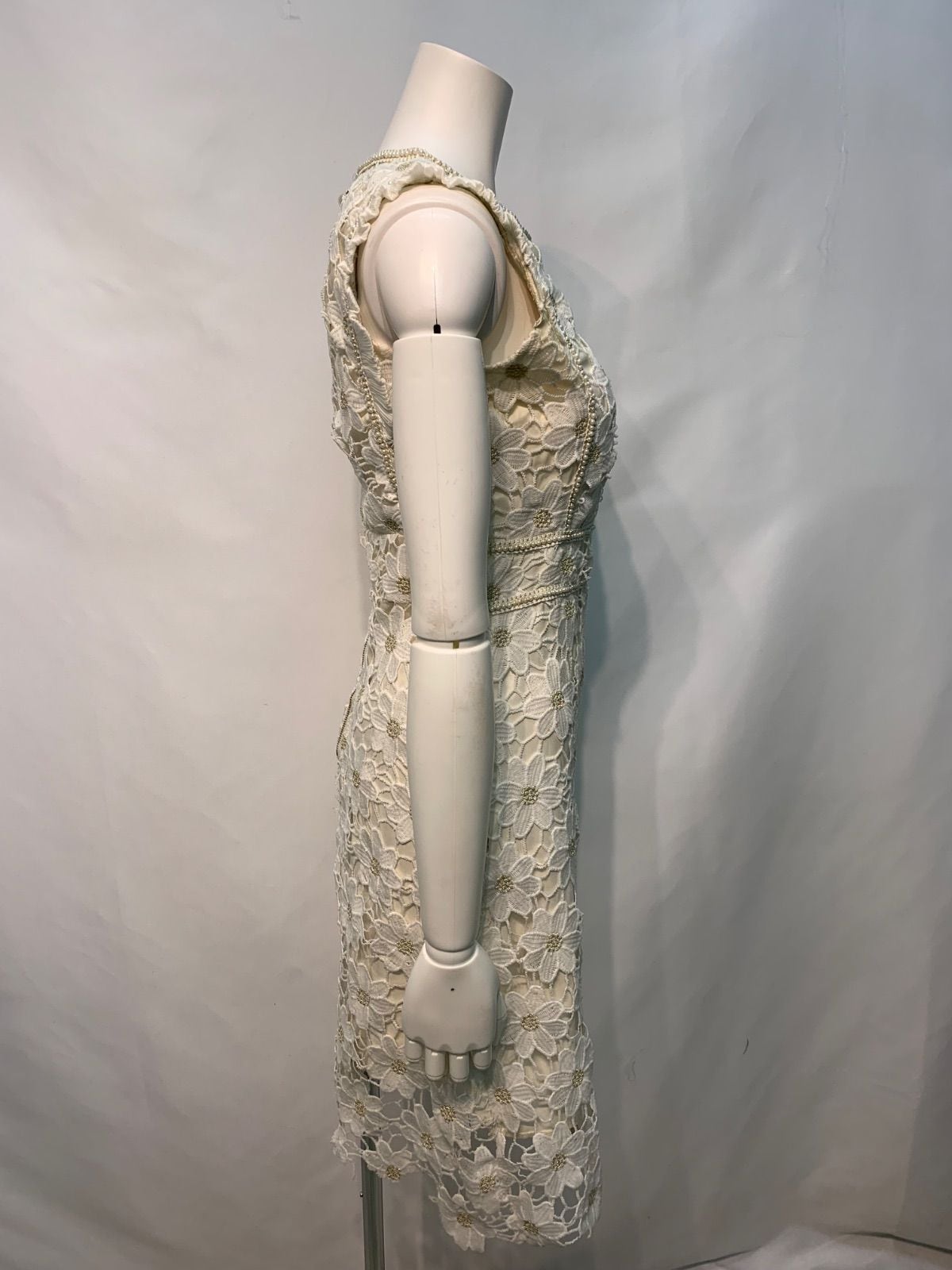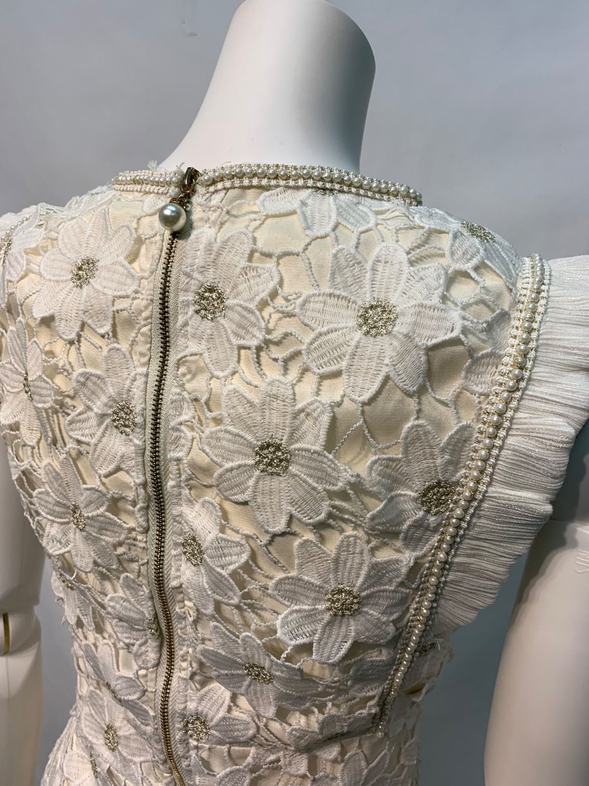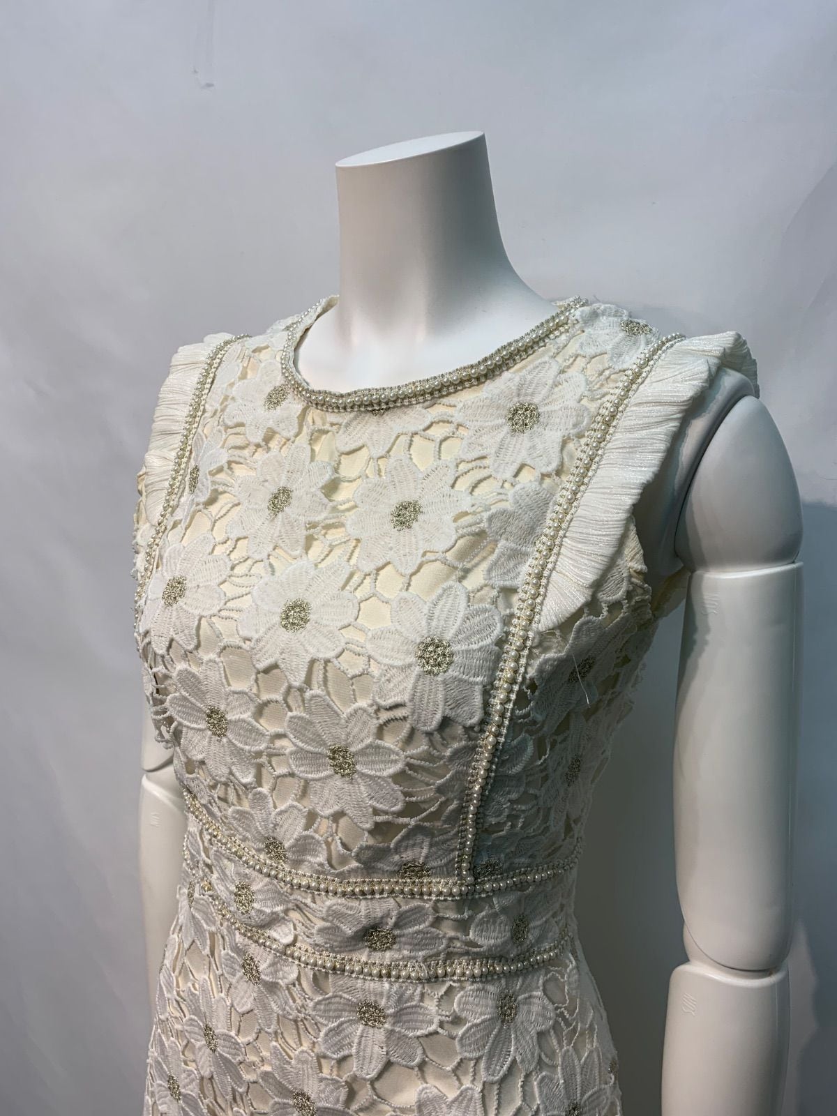 2370 Salang キャバクラ ドレス 総クロシェレースフラワー パール ノースリーブ フリル ミディ キャバドレス S