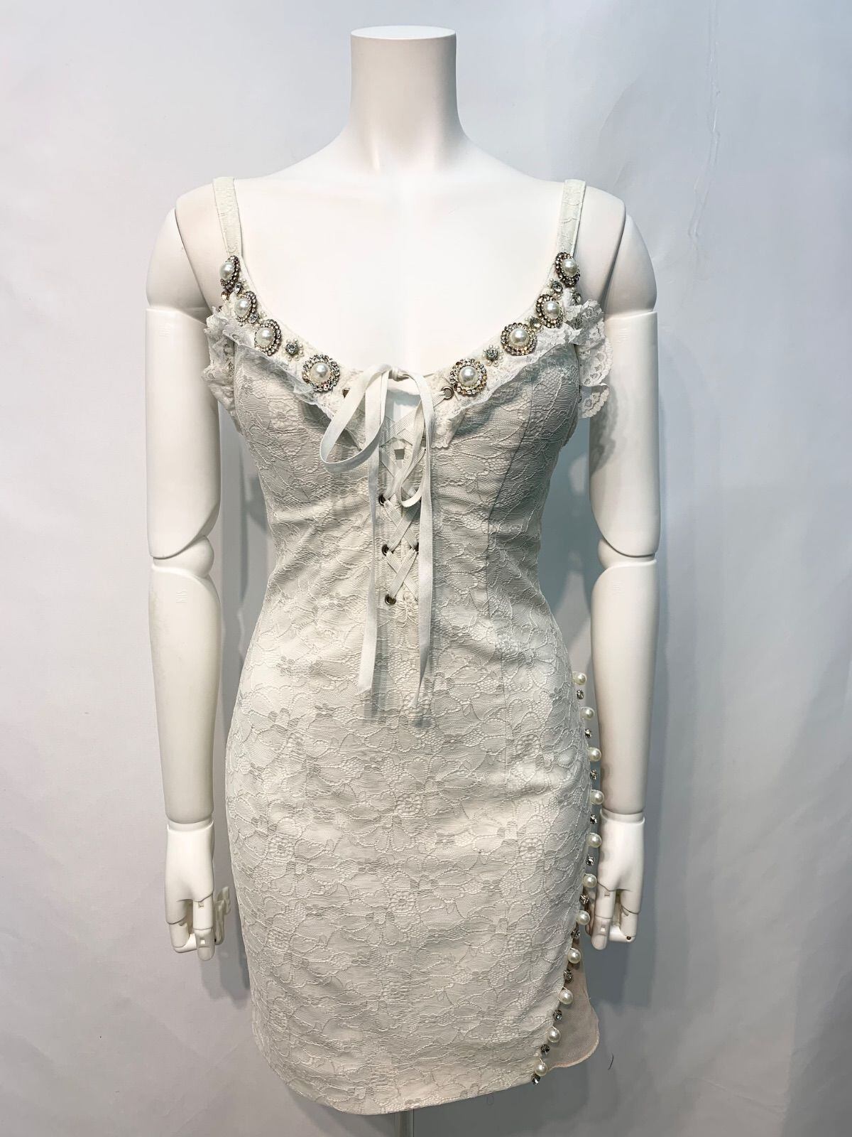 2369 ROBE de FLEURS ローブドフルール キャバクラ ドレス 総レース ビジューストラップ タイト レースアップ ミニ キャバドレス S